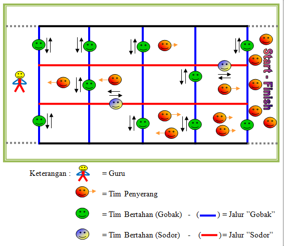- Setiap kamar kotak harus diisi oleh tim defense sesuai dengan jalur gobak dan sodor.